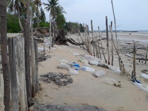 Abrasi yang dipicu oleh ombak besar serta aktivitas pengambilan kerikil (krikil) untuk kebutuhan hidup sehari-hari membuat bibir pantai di wilayah tersebut semakin terkikis.