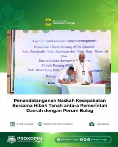 Bupati Lingga bersama Wakil Bupati Lingga dan Sekretaris Daerah Kabupaten Lingga menghadiri kegiatan Penandatanganan Naskah Kesepakatan Bersama Hibah Tanah antara Pemerintah Daerah Kabupaten Lingga dengan Perum Bulog. Kegiatan tersebut dilaksanakan pada Jumat, 06 Februari 2026, bertempat di Hotel Grand Mercure Batam.
