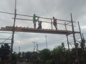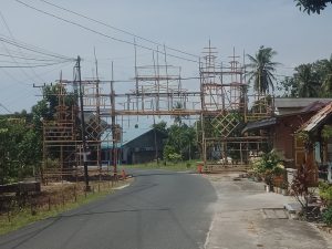 Sejak beberapa hari terakhir ini para pemuda bersama orang tua terlihat bergotong royong memotong, menyusun, dan merakit kayu menjadi kerangka gerbang yang megah di pintu masuk kampung.