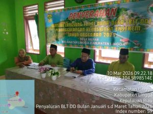 Diakhir kegiatan kaur keuangan Desa menyampaikan total DD yang hari ini langsung disalurkan kepada masyarakat adalah Rp 68.100.000.kalau untuk siltap perangkat desa,tunjangan BPD dan honor RT,RW bulan Febuari dan maret mohon maaf belum dapat dibayarkan,karena Dananya belum masuk rekening Desa.masih menunggu info dari BPKAD Kabupaten Lingga.kita harus bersabar ya.mudahan sebelum hari raya ini ada kabar baiknya.lebih lanjut biar pak kades kordinasi sama pihak kabupaten,tutup mazlinda.zfb
