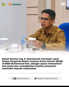 Bupati Karimun Ing. H. Iskandaryah memimpin rapat Dewan Pengawas Badan Layanan Umum Daerah (BLUD) di RSUD Muhammad Sani, sebagai upaya memperkuat tata kelola dan meningkatkan kualitas pelayanan kesehatan kepada masyarakat.